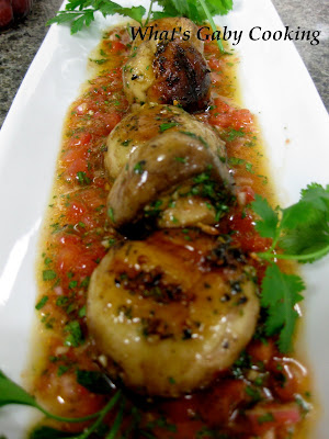 Grilled Herbed Mushrooms in a Cold Tomato Dressing – one of my new favs!