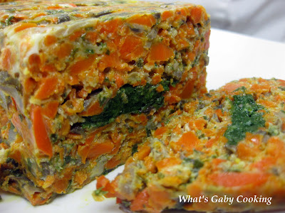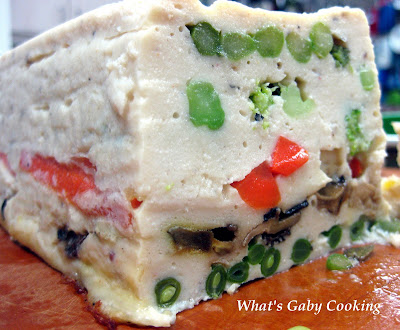 This is a Spring Vegetable Terrine… which is a combination of Fish Mousse and Vegetable layers including broccoli, carrots, asparagus, green beans, mushrooms and zucchini.