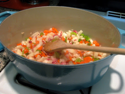 Add the pancetta and minced vegetables and sauté, stirring frequently with a wooden spoon, about 10 minutes.