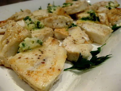 I did a dinner party for 8 this weekend and the main course was this fantastic Halibut! Now… I have never been a big fish person but I am starting to like it! This Halibut is super easy to make and its topped with an herb butter.