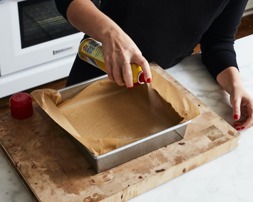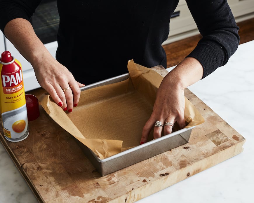 - Heat oven to 350 degrees F. Line bottom of a 9-inch square pan with parchment paper. Then lightly spray the parchment with cooking spray.