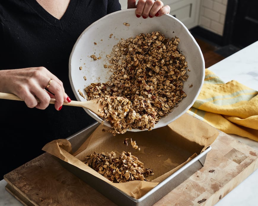 Really press the mixture down in the pan. Use a spatula or your clean hands and press the granola bar mixture down once you’ve transferred it into the pan. And feel free to put some weight behind it. That will help ensure the bars don’t fall apart when you’re slicing and serving.