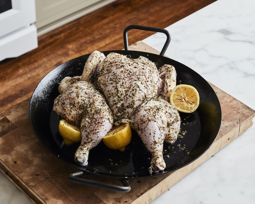 - Preheat the oven to 400°. Using poultry shears, cut along each side of the chicken backbone and remove it. Turn the chicken breast side up and press on the breastbone to flatten the chicken. Rub the chicken all over with the olive oil, oregano, thyme, lemon zest, juice and rosemary. Generously season with salt and pepper.