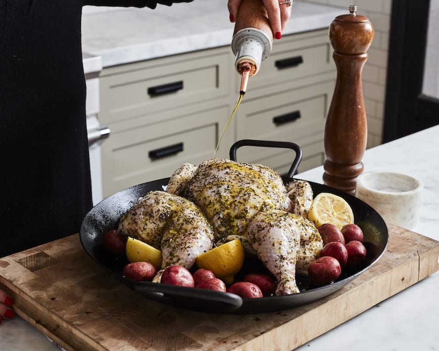 season with salt, pepper and herbs tuck lemons around the bird for extra flavor add some baby potatoes to soak up all the drippings drizzle with olive oil
