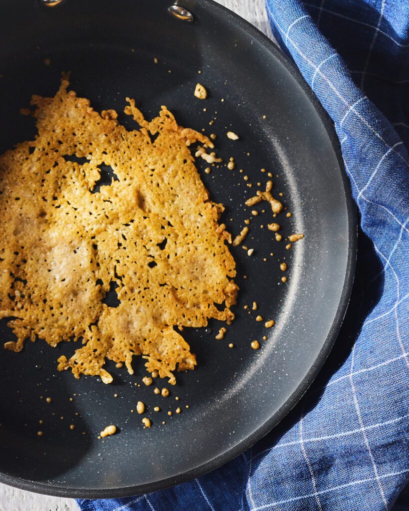 - Heat up a heavy-bottomed, non-stick All-Clad pan over medium heat. Sprinkle 3 tablespoons of shredded cheese in the center of the pan, in circular shape. You want a thin, even layer. Once the cheese melts a bit, flip and continue to cook.