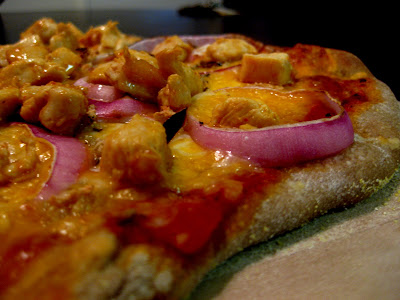 • Saute the chicken in a small saute pan and add the cholula sauce. Then get ready to assemble the pizza - start with the dough, then the sauce and the pizza, onions, garlic and chicken. Dust the top of the pizza with paprika. Place the pizza in the oven for about 12 minutes and then remove. Season with some extra salt and pepper and serve!