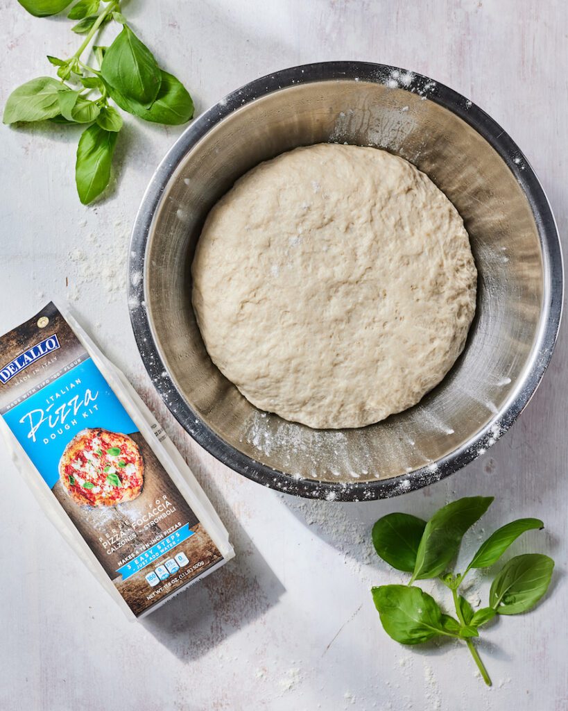 Let’s break this down shall we. Typically I do a pizza with a 1/2 lb of crust… today we’re getting crazy and going with the full quantity of pizza dough. Delallo’s pizza dough kit is my go to. Everything is in one little package and you just add liquid. It’s simple, uber dependable and I LOVE it. It makes an excellent crust and it’s a great way to have an authentic dough on hand at all times. It’s also going to result in a puffier pizza which is perfect because wait until you hear what going on top.
