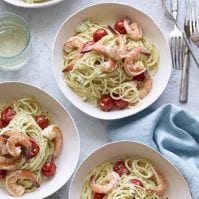 Add the garlic and cook for 30 seconds. Add the broccoli and sauté for 2-3 minutes until bright green. Add the goat cheese and 1/2 cup of the reserved pasta water and stir to combine until you have a creamy consistency. Add more of the reserved water if needed to ensure a creamy consistency. Add the cooked pasta and the cooked shrimp and toss to combine.