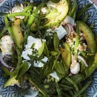 Transfer the grilled green beans to a large bowl and toss with vinaigrette, whole mint leaves, red onions, radishes, feta and farro. Toss to combine. Transfer to a serving platter and tuck the avocado into the salad. Garnish with additional herbs and serve.
