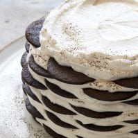 Spread about 2/3 cup whipped cream on top of the bottom cookie layer, making a 7-inch circle. Repeat with remaining cookies and cream, making 11 or 12 layers of cookies and ending with a layer of cream (there will be a few cookies left over - you should just eat them). Cover with plastic wrap and refrigerate overnight.