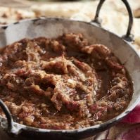 Add the eggplant flesh, using the back of a spoon or fork to crush any big lumps. Stir in the cilantro and cook for 10 to 15 minutes, stirring often, to form a mixture that is thick yet not dry. Transfer to a serving bowl. Fold in the lemon juice and the remaining 2 1/2 tablespoons oil. Taste and add more salt, as needed.