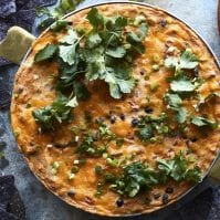 In a large bowl on medium speed, beat together the cream cheese, sour cream, chili powder, cumin, garlic powder, and salt until smooth and well combined. Reduce speed to low then beat in the enchilada sauce until incorporated. Stir in the beans, tomatoes, corn, 1/2 cup cheddar cheese, and shredded chicken.