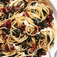 This 10ish minute Sun Dried Tomato and Kale Pasta will be your new go-to! It's made of mostly pantry staples and some fresh kale and couldn't be more delicious!
