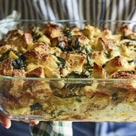 Transfer the Pyrex, foil and all, into the oven and bake for 20 minutes. After 20 minutes, remove the foil and continue baking until the top is browned and the strata is cooked through, 40 to 50 minutes more.