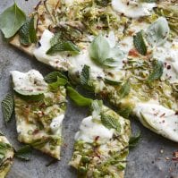 Remove pizza from the oven and top with the burrata, lemon zest and juice. Season with salt and pepper and additional red pepper flakes if needed, add mint at the very last minute, slice and serve.