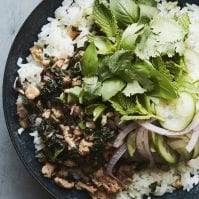 To assemble, place equal amounts of the coconut rice at the bottom of 4 bowls, followed by equal amounts of the chicken mushroom mixture, pickled vegetables and plenty of the fresh herbs. Serve immediately.