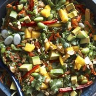 Add the cooked edamame, cashews, avocado and mango to the bowl with all the ingredients. Add the dressing and toss to combine. Serve immediately.