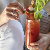 Run a lime or a lemon across the rim of a glass and dip into salt to coat. Fill the glass with ice and strain the Bloody Mary mixture into the glass.