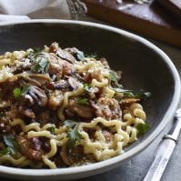 Once the mushrooms and shallots are caramelized, add garlic and cook for 30 seconds until fragrant. Increase the heat to medium and add wine. Let the wine bubble and cook for 2-3 minutes. Add chicken and pasta both to the skillet, tossing multiple times to coat. Turn off heat and stir in grated cheese. Drizzle brown butter (make sure you get the brown bits!) over top, tossing to coat a few more times. Serve with additional cheese and chopped parsley.