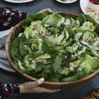 Toss the full leaves, avocado and snipped chives with the lemon shallot vinaigrette and serve on a large platter.