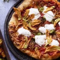 Remove pizza from the oven and top with the burrata, extra squash blossoms and season as needed.