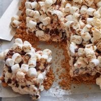 Stir in the popcorn and mix until the popcorn is well coated. Fold in the frozen mini chocolate chips. Immediately transfer the mixture into the prepped baking dish pressing it firmly into an even layer. Sprinkle with the remaining 1 cup of marshmallows and torch the top.