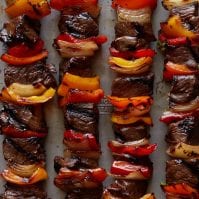 Thread beef onto metal skewers, alternating with the onion and colorful bell peppers. Discard the marinade.
