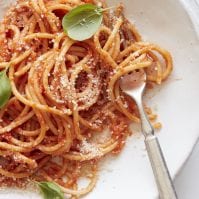 Discard basil and heat skillet over high heat. Stir in reserved pasta water to loosen sauce; bring to a boil. Add pasta and cook, stirring, until sauce coats pasta and pasta is al dente, about 2 minutes. Remove pan from heat; add butter and cheese; toss until cheese melts. Transfer to warm bowls; serve with more cheese and more basil, if desired.