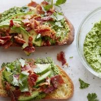 Slather a few tablespoons of the Green Harissa on each piece of bread. Top with ½ avocado thinly sliced and fanned out and finish with equal amounts of the cooked bacon and herbs. Serve immediately.