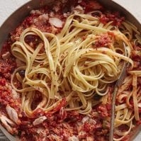 Drain tomatoes and add to skillet, season with salt and pepper. Raise heat to medium-high and cook, stirring occasionally, until tomatoes break down and mixture becomes saucy, about 10 minutes. Stir in the tuna, olives, capers and red pepper flakes, and continue to simmer.