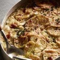 Pour the cream mixture evenly on top of the potatoes and sprinkle the remaining 1/4 cup of Gruyere cheese evenly on top. Bake until golden brown and bubbly and the potatoes are fork tender when pierced with a knife, about 45 minutes to 1 hour. Let the gratin rest for about 15-30 minutes before serving. Garnish with thyme and serve.