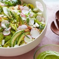 Arrange the remaining salad ingredients in a large serving bowl. Once the quinoa has cooled, add that to the salad. Drizzle with the dressing and serve.
