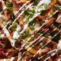 Transfer to a oven proof baking dish or sheet pan and sprinkle with the shredded cheeses, bacon and transfer back into the oven for 5-8 minutes until melted. Remove and top with chives. Serve immediately with Hidden Valley Simply Ranch drizzled on top.