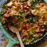 Lightly spray a large skillet with non-stick spray, and transfer the mixture into the baking dish. Top with the remaining shredded cheese and bake for about 20 minutes until the top layer of cheese is bubbly and melted. Remove the baking dish from the oven and garnish with green onions and serve.