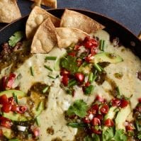 Melt the butter in a medium saucepan over medium heat. Cook onion, poblano, jalapeños, and garlic, for 8–10 minutes until soft. Add the salsa and stir to combine. Stir in flour and cook until incorporated, about 1 minute. Whisk in milk and continue to cook until mixture comes to a boil and thickens, about 5 minutes. Reduce the heat to low, and add all the cheeses, stirring constantly, until cheese is completely melted and queso is smooth. If it seems too thick or gloopy, stir in a tablespoon of milk at a time until smooth.