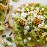 Slater the mashed avocado on top of the toast, followed by the crumbled goat cheese, charred corn and chopped chives.