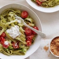Divide evenly amongst 4-6 bowls. Top with a scoop of burrata that is to be mixed into the pasta upon eating, and garnish with bread crumbs, salt, pepper and basil leaves.