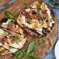 We're grilling pizza and loading it up with the perfect summer toppings like peaches, mozzarella and salty Prosciutto!