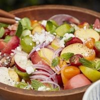 Arrange the tomatoes, stone fruit and red onions on a large platter or bowl. Top with basil, mint, feta and salt and pepper. Toss with Lemon Champagne Vinaigrette