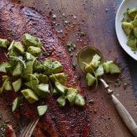 Bake salmon for about 15-20 minutes until done. Remove and transfer to a serving platter. Top with Avocado Cucumber Salsa and lemon wedges before serving.