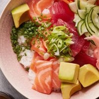 Transfer equal parts to 2 bowls and top with piles of the avocado, cucumber, carrots, scallions, chives, pickled ginger and the fish.