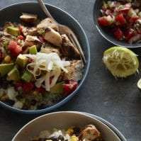 To the bowls add the chicken, black beans, charred corn, avocado, and cilantro, pico, cheese and serve with limes.