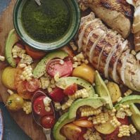 Transfer chicken to a platter and top with the avocados, cherry tomatoes and raw corn cut off the cob. Serve with the cilantro vinaigrette and season with salt and pepper.