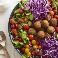 In a large bowl, combine the lettuces, cabbage, cucumber, tomatoes and fresh herbs. Add the falafel on top and serve with the dressing on the side.