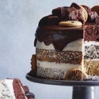 To assemble the cake, place one layer of the cake on a cake stand. Spread a 1/2 inch layer of the Swiss Buttercream on top and carefully place the 2nd layer of cake on top. Repeat the process with additional Swiss Buttercream. Add the last layer of cake of top. Frost the top of the cake with more of the Swiss Buttercream and add a super thin layer of the Swiss Buttercream to the sides of the cake. Frost until smooth. Drizzle with ganache and decorate with any desired toppings and serve as needed.