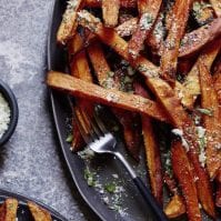 Rinse and dry the sweet potatoes. Cut the unpeeled potatoes lengthwise into slices 1/2 inch (12 mm) thick, and then cut each slice into batons about 1/4 inch (6 mm) wide and 3 inches (7.5 cm) long.