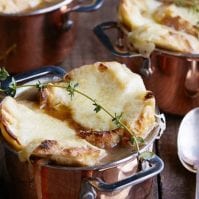 Melt the butter in a large pot over medium heat. Add the onions, garlic, bay leaves, thyme, and salt and pepper and cook until the onions are very soft and caramelized, about 25 minutes. Add the wine, bring to a boil, reduce the heat and simmer until the wine has evaporated and the onions are dry, about 5 minutes. Discard the bay leaves and thyme sprigs. Dust the onions with flour and give them a stir. Turn the heat down to medium low so the flour doesn't burn, and cook for 10 minutes to cook out the raw flour taste. Now add the beef broth, bring the soup back to a simmer, and cook for 10 minutes. Season, to taste, with salt and pepper.