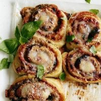 In the last two minutes of baking, pull rolls out of the oven and top with extra shredded mozzarella and a light sprinkle of the remaining Parmesan cheese. Place rolls back into oven and bake until cheese melts. Remove rolls from the oven, let rest for 5 minutes and sprinkle with basil before serving.