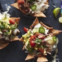 Using 4-5 small cast iron skillets, layer a handful of the tortilla chips and top them with the carnitas and shredded Monterey jack. Stick the skillets into a 350 degree oven to melt the cheese. Once melted, remove and drizzle with the queso. Then, sprinkle with the mango avocado salsa, cilantro, jalapeños, cherry tomatoes.