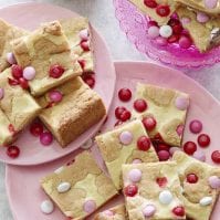 Crumble and sprinkle the remaining cookie dough on top of the cheesecake mixture and then sprinkle with the remaining Valentine’s Day M&M’s.